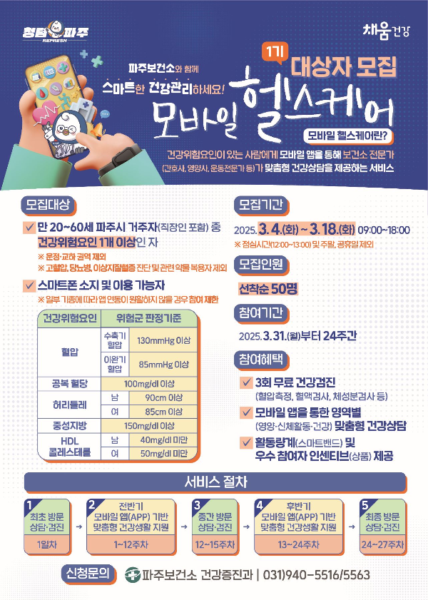 파주보건소에서는 사회적·경제적 활동으로 인해 건강관리가 어려운 청장년층을 대상으로 모바일 기반 맞춤형 건강관리 서비스를 제공하는 **「모바일 헬스케어사업」**을 운영합니다. 건강을 보다 체계적으로 관리할 수 있는 기회이니, 많은 관심과 참여 부탁드립니다.